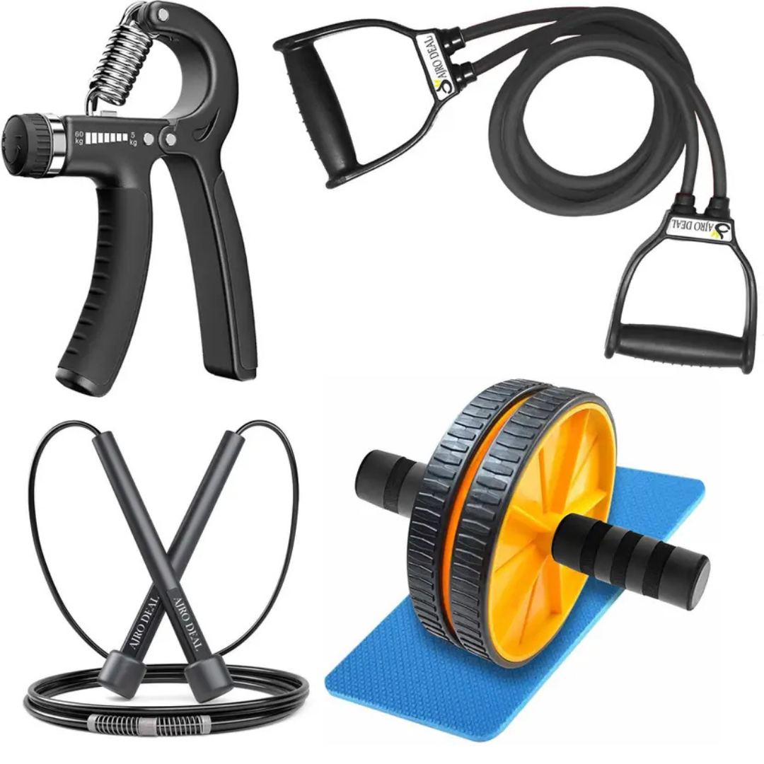 Elevate your fitness journey with the AJRO DEAL 4-in-1 Fitness Kit, thoughtfully designed to support both beginners and advanced fitness enthusiasts. This complete workout kit includes an Ab Wheel Roller, Hand Grip, Resistance Tube, and Skipping Rope—the perfect combination to help you strengthen your core, improve endurance, and build overall body strength. Whether you prefer working out at home, the gym, or on the go, this compact and versatile fitness accessory kit ensures you stay on track with your goals.